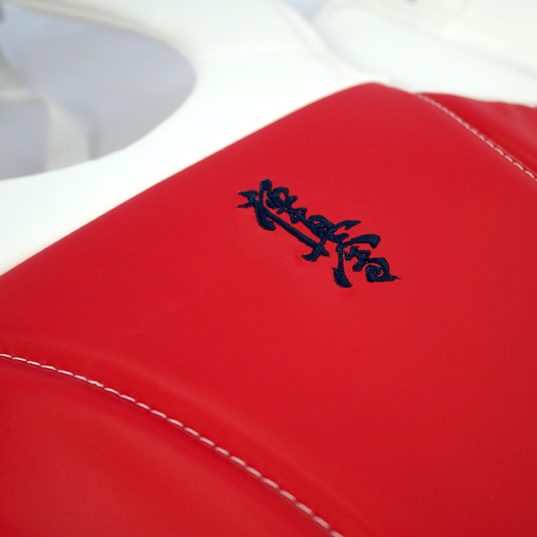 Pancerz tułowia "HOGO" dwukolorowy biało (shiro) - czerwony (aka). Świetnie nadaje się na różnego rodzaje zawody, wykonany z pikowanej pianki o podwyższonej gęstości. Pokrycie to skóra ekologiczna o wysokim połysku. Na środku ochraniacza wyhaftowana lilijka Kyokushin.