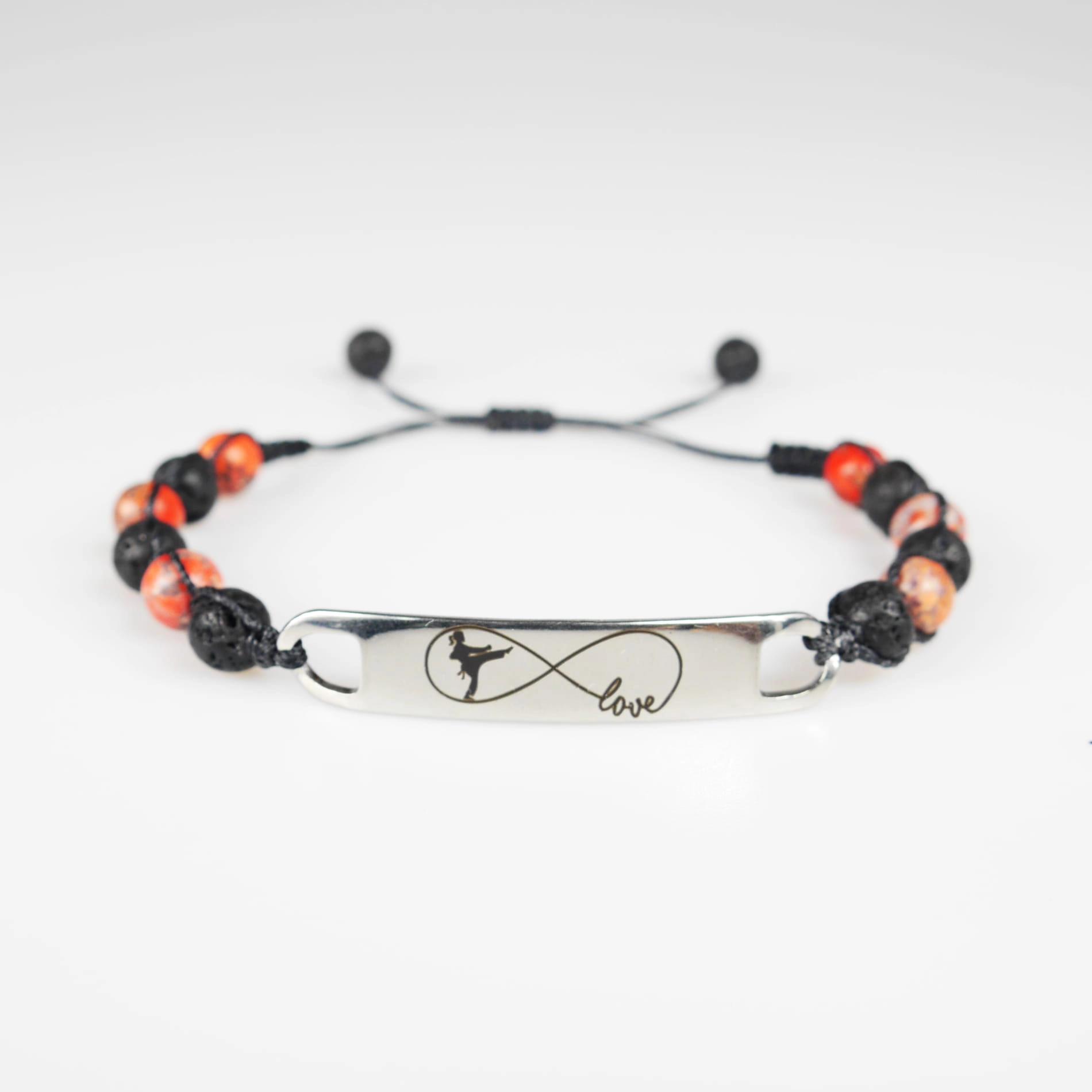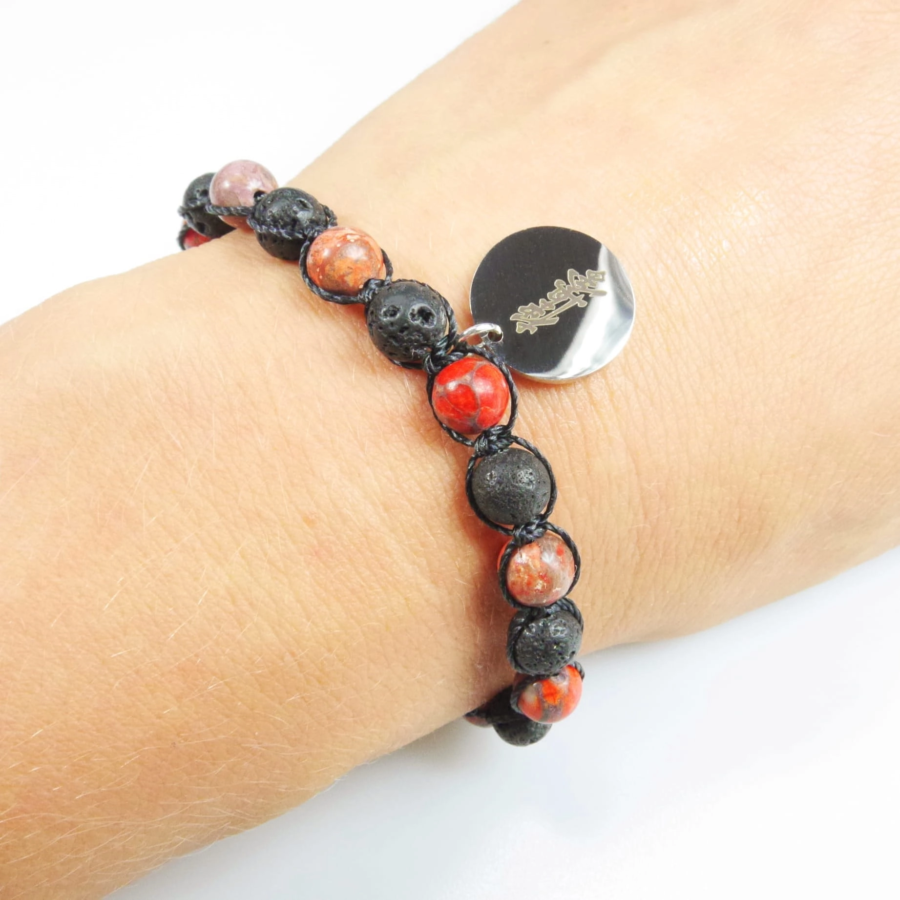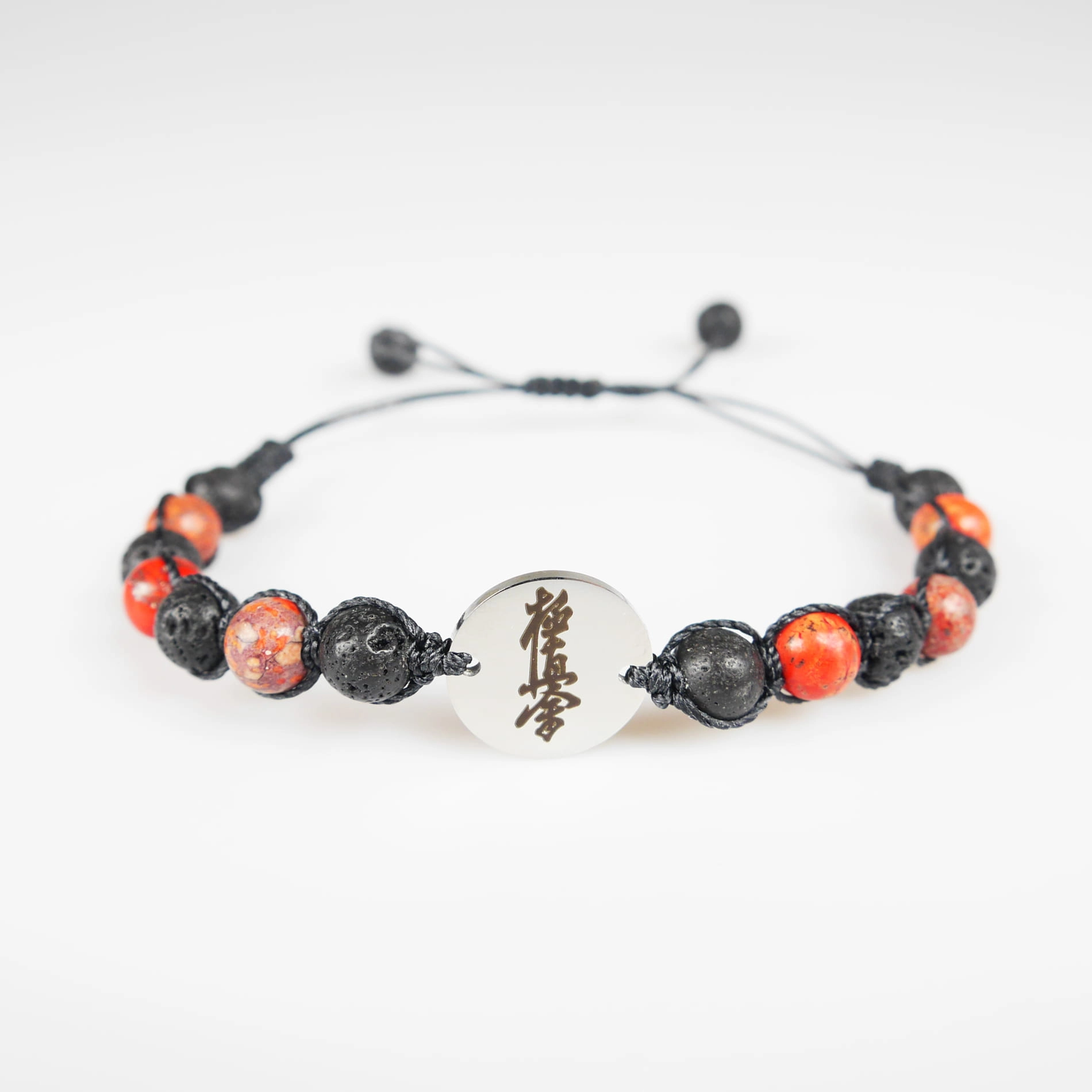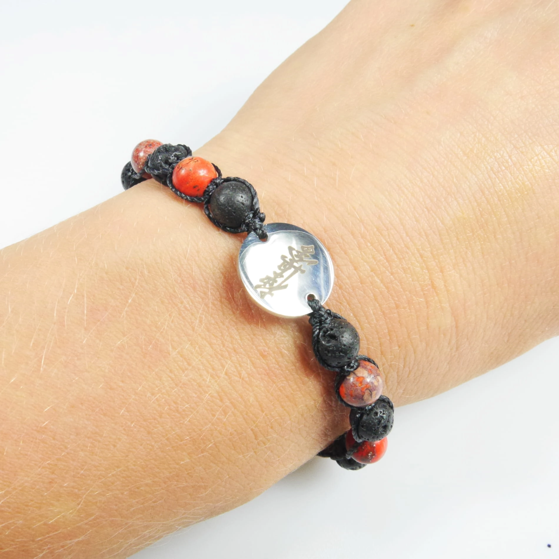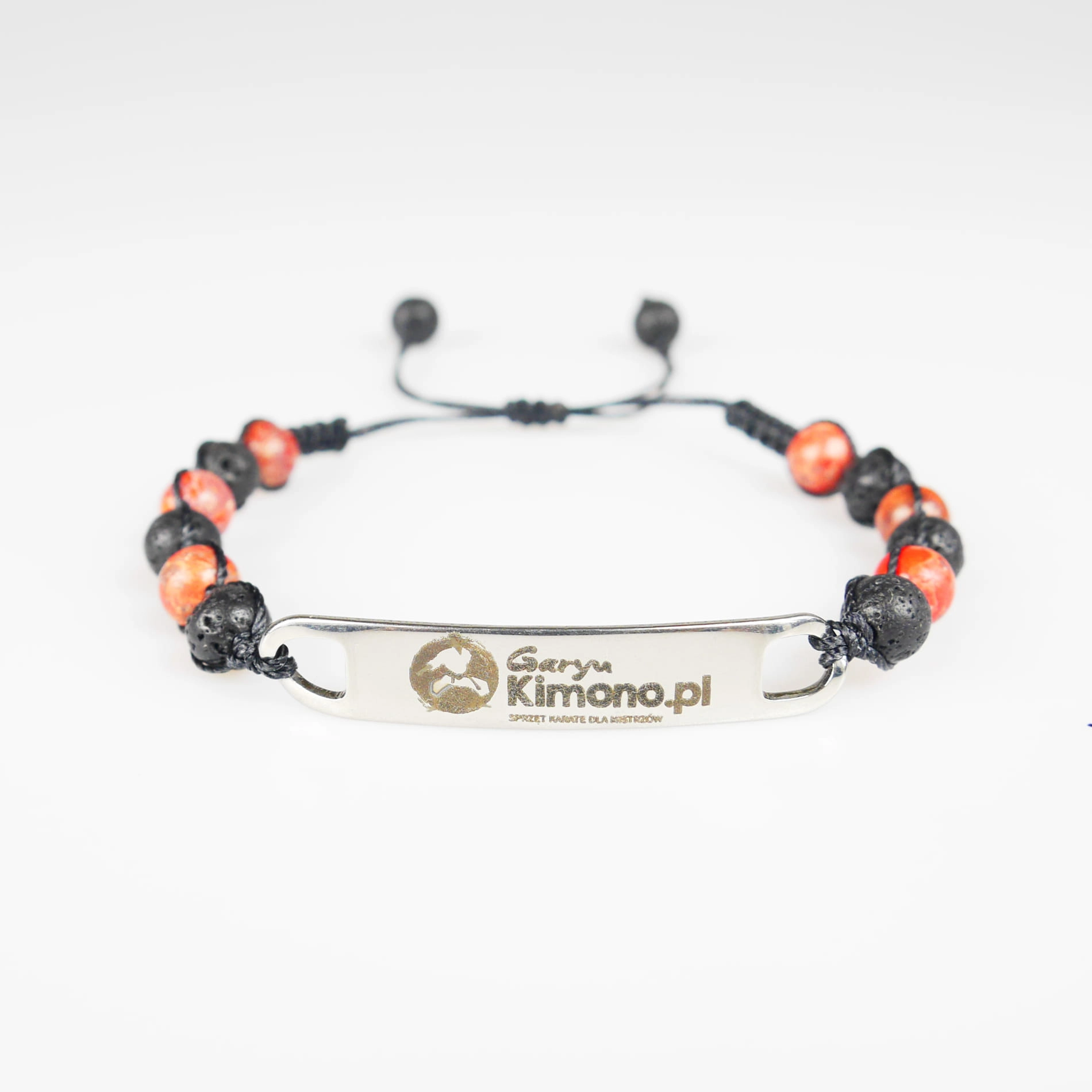 Bransoletka z grawerowaną zawieszką z koralikami z naturalnej lawy wulkanicznej (skała magmowa) i kamienia – czerwonego turkusu. Bransoletka jest ręcznie wykonana z najwyższą starannością. Zapakowana w ozdobny woreczek. Doskonała na prezent dla osoby trenującej Karate.