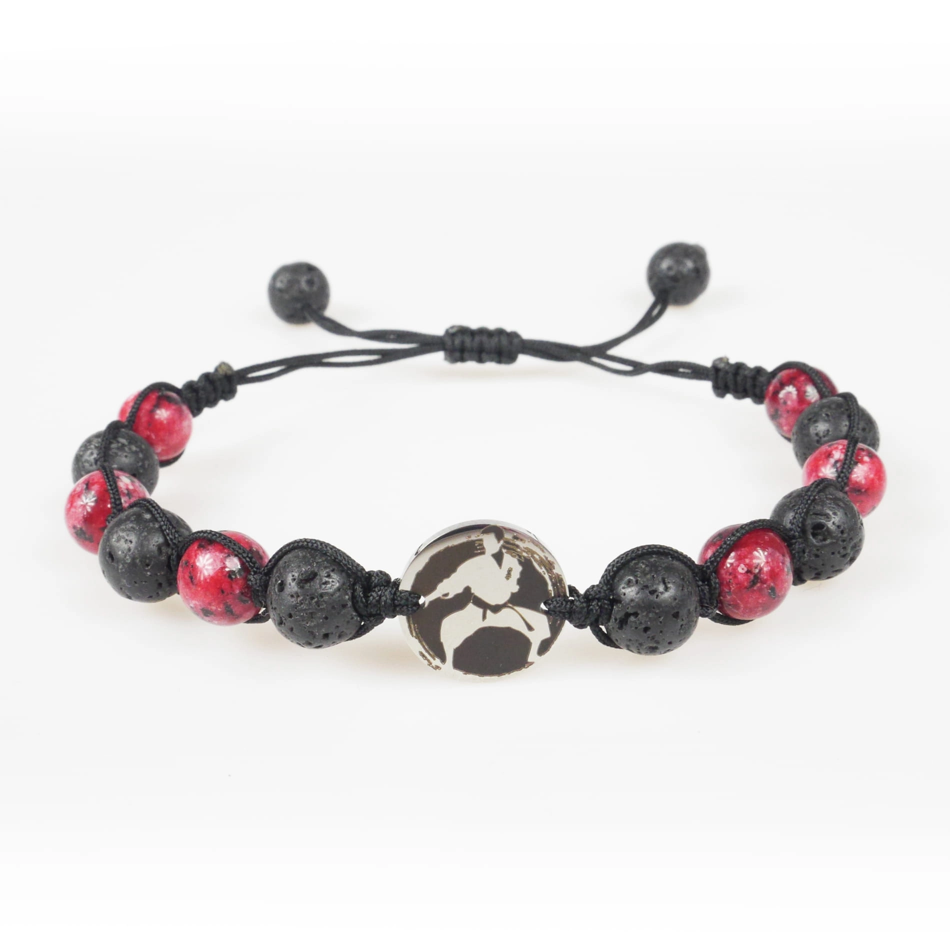 Bransoletka Karate z lawy wulkanicznej i czerwonego jadeitu z grawerowaną zawieszką. Prosimy o wybór zawieszki.