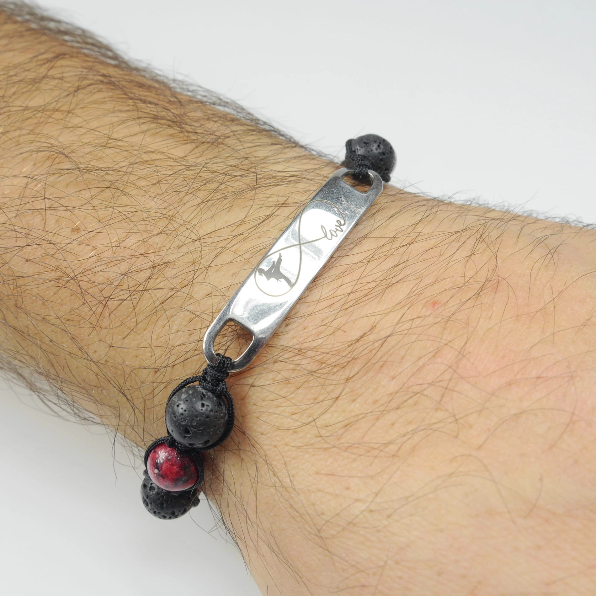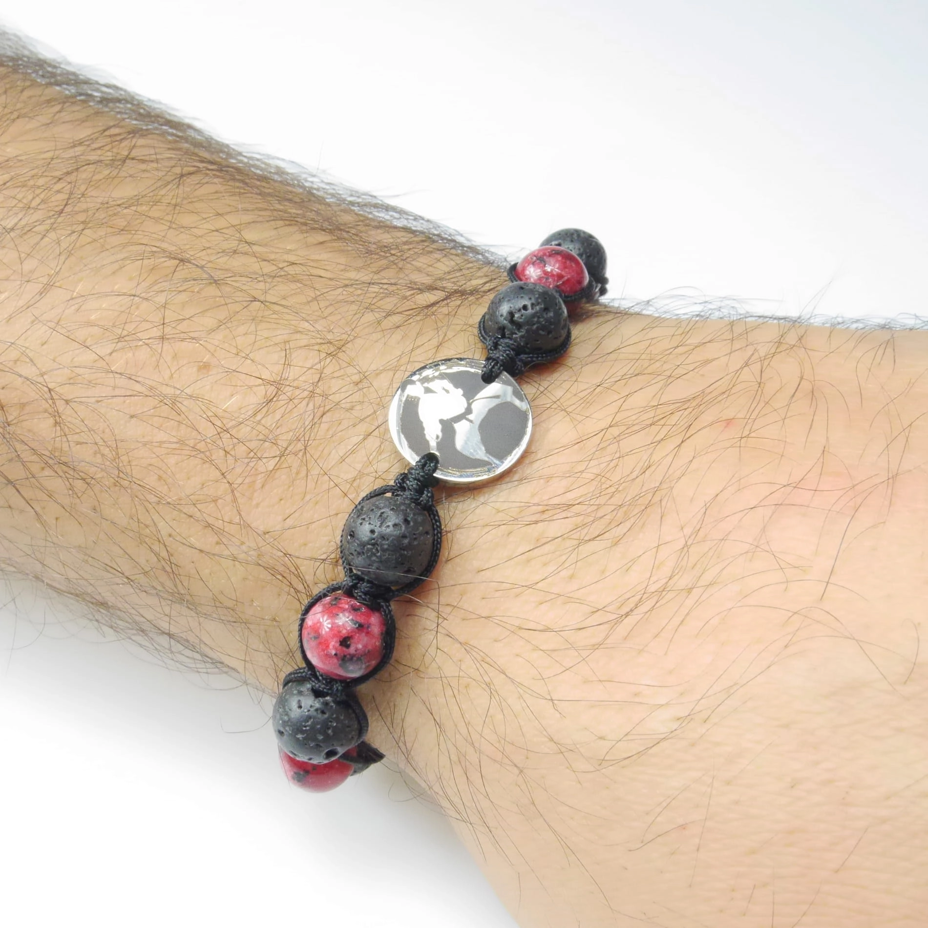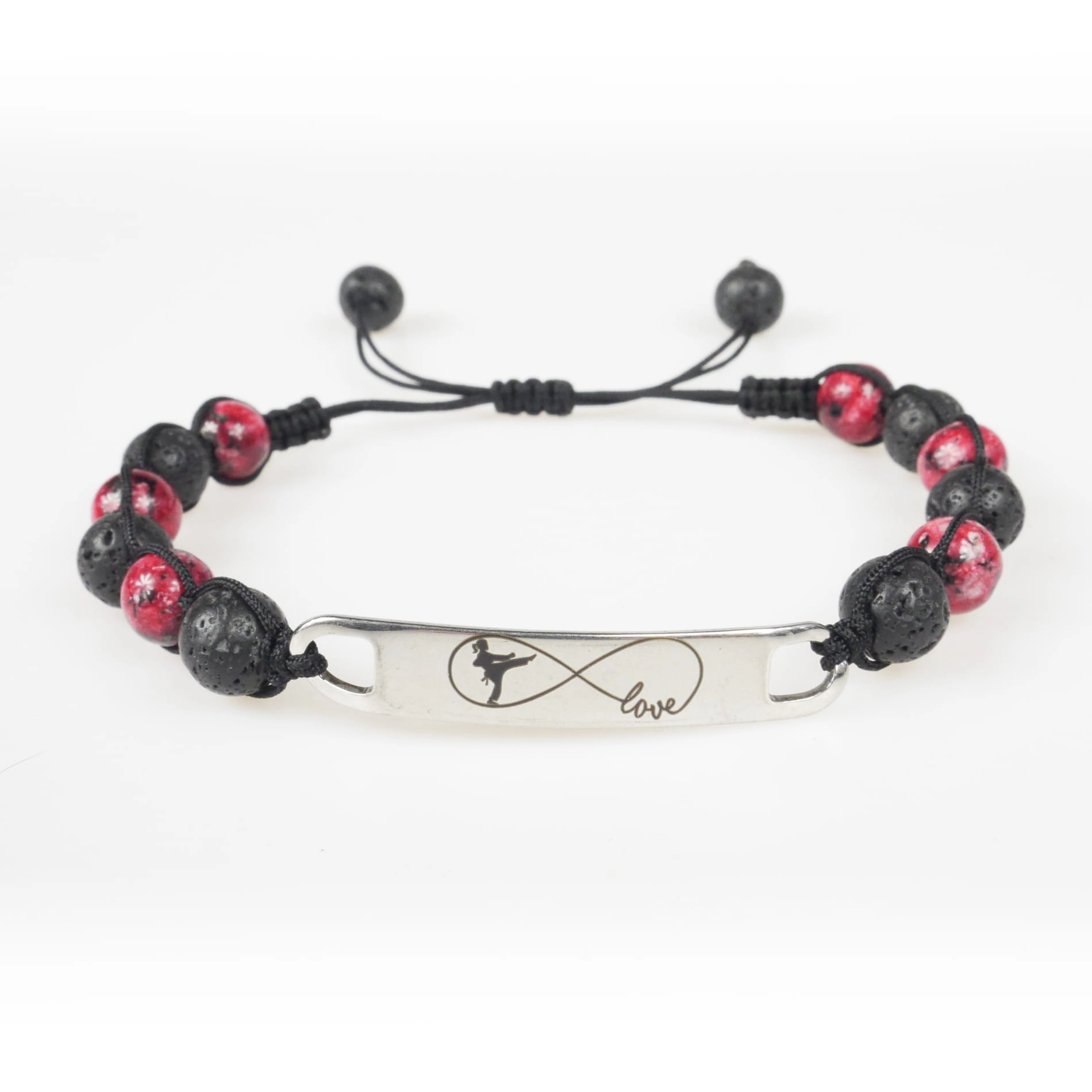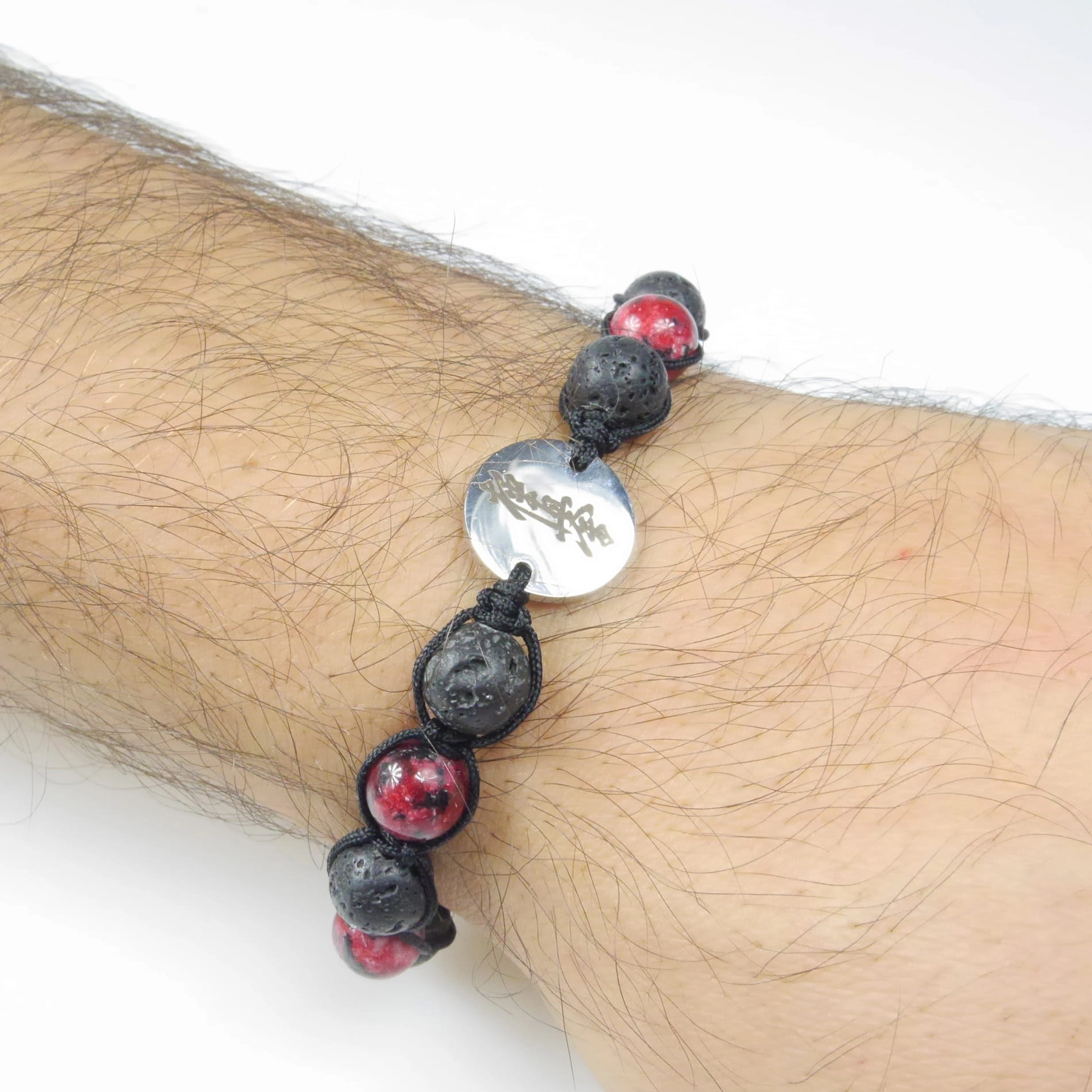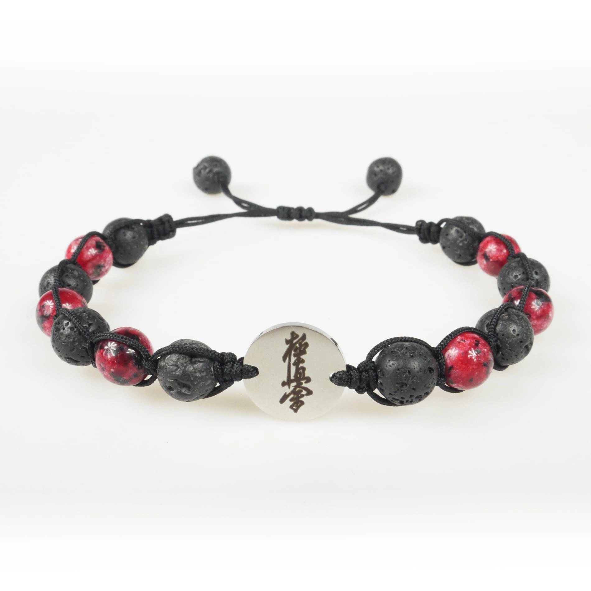 Bransoletka z grawerowaną zawieszką z koralikami z naturalnej lawy wulkanicznej (skała magmowa) i kamienia – jadeitu czerwonego. Bransoletka jest ręcznie wykonana z najwyższą starannością. Zapakowana w ozdobny woreczek. Doskonała na prezent dla osoby trenującej Karate.